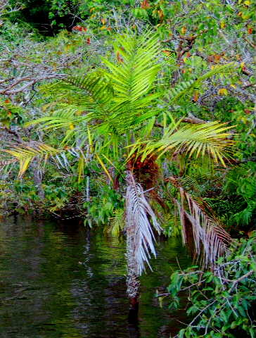 The steep embankment is lined with rampant vegetation and many species of Astrocaryum, Bactris and Euterpe can be found. At the waters edge the prominent species are Mauritia flexuosa and Leopoldinia pulchra.