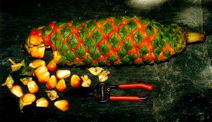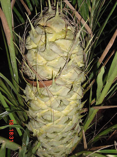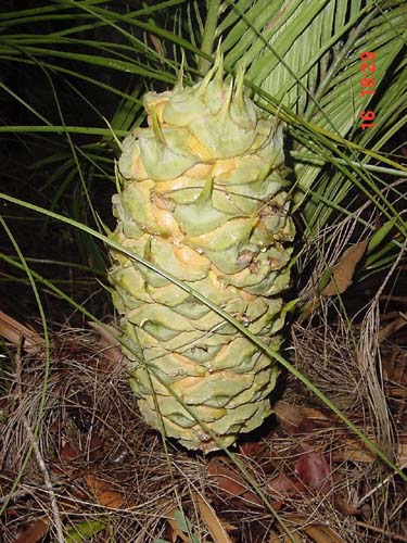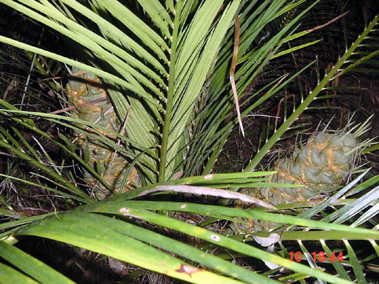 The cones start to mature approximately in January and can be harvested up to May. After this time most cones have split and been scattered by wild animals and only the occasional seed can be found near the parent plant. The orange coating on the seed is eaten by possums, bandicoots and dingos causing the seeds to be readily distributed throughout the immediate area. Domestic dogs have also been seen nibbling at the fresh seed coatings and upon nibbling them myself the taste was found not to be unpleasant. The starchy kernels are also eaten by other animals. Toxic compounds are present within the seed proper but can be removed by vigorous washing and pounding. Some cones appear to be light orange colour when mature but others found were dark red and still not ripe. It is thought that differing degrees of sunlight have some influence upon this colour variation but after closer investigation it was found that both coloured cones were appearing on plants growing in the same area. It has hence been concluded that intenseness of colour is not an indication of maturity. Perhaps this colour variation is caused by soil composition.