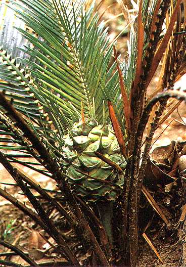 Before I was aware of this I had noticed the similarities of the Gympie plants and the Fraser Island plants. Adding to the diversity of the species, the Fraser Island plants grow on sandy wallum loam and because of the nature of the habitat must receive considerable ground moisture from the freshwater lakes, creeks and springs that abound on the island. The largest plants we found near the sand tracks were two metres tall at the apex of the centre leaves Large heavy cones about 40cm long were well formed but immature in January. Near the centre of the island, I was shown several plants with thick established trunks about 30cm tall. Here also we found a few large plants of the glorious primitive fern Angiopteris. Returning to the mainland west of Bundaberg we find Macrozamia miquelii on Mount Perry, formerly known as M. mountperriensis but with that name now synonymous. It is smaller and not so prolific in the frond number. Another form, very similar to that of the Upper Brookfield colonies, occurs on Mount Archer near Rockhampton and again at Bowenia National Park north of Yeppoon where it grows in abundance with [Bowenia serrulata].