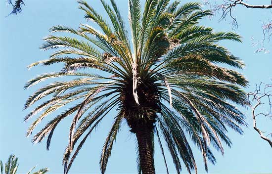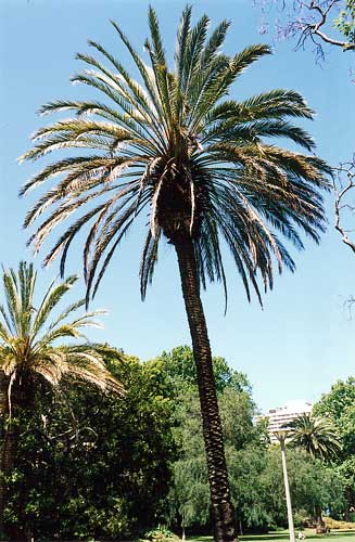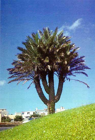Probably the second most well-known palm after the coconut (Cocos nucifera), this palm produces dates. However, despite this palm being extremely adaptable to differing growing conditions, from hot, dry deserts, to wet tropics, and thru to cold-temperate regions, it will only produce dates in the hot, dry climates. It is also very salt-tolerant, making it good for coastal planting. The branching seen in Figure 4 is not uncommon in date palms, however, it only occurs in male plants. The famous 'Imperial Palm', at Huerto del Cura, Elche, Spain, is 150 years old, and has eight branches.