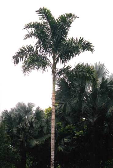 A tall, slender, solitary, pinnate palm to about 20m, similar in appearance to the Cocos nucifera.