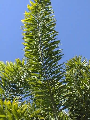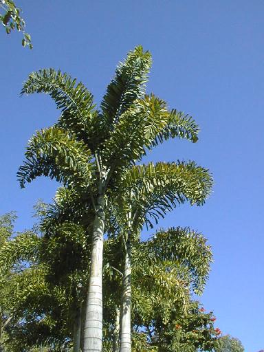 A tall (up to 10m tall with a grey trunk), solitary, very attractive palm with long (2-3m.) plumose leaves (hence the name 'Foxtail'). It produces large (about the size of a duck egg) orange fruit.