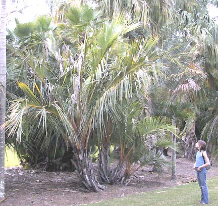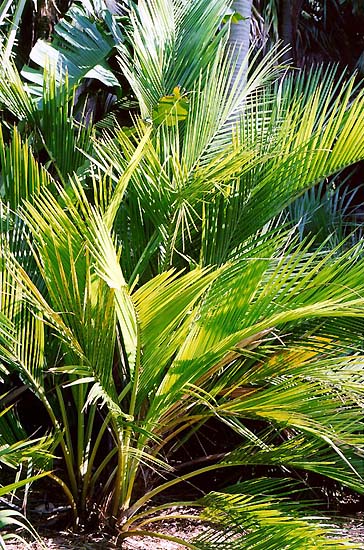 A clumping, pinnate leaved palm to about 5m tall, with the leaves being arranged in five ranks.